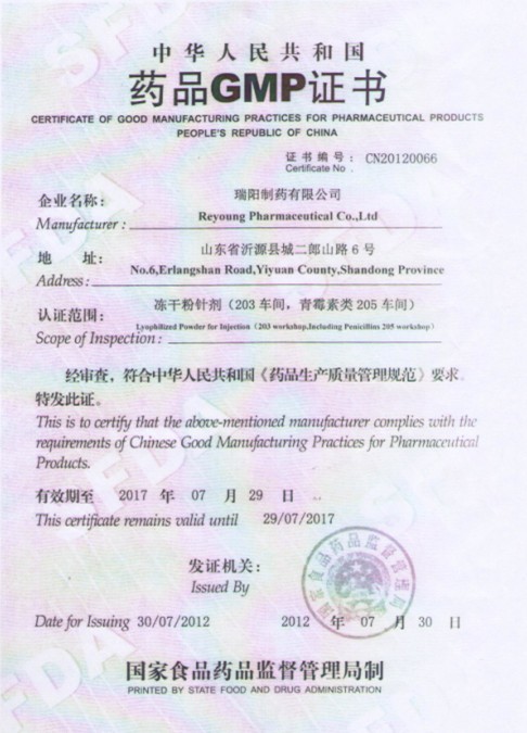 恭喜我公司合作的山東瑞陽制藥廠榮獲GMP證書!