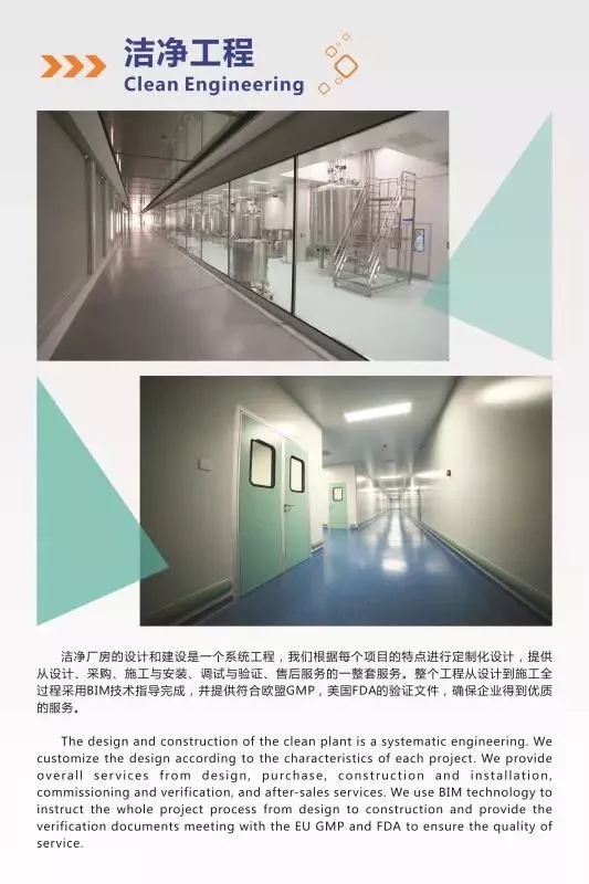 公司嚴(yán)格按照潔凈廠房設(shè)計(jì)、施工規(guī)范,中國GMP、cGMP、EuGMP等規(guī)范要求,為生物醫(yī)藥、食品飲料、電子、航空航天、科研教學(xué)、電力等行業(yè)提供潔凈廠房、空氣凈化、潔凈管道系統(tǒng)、自動(dòng)化控制系統(tǒng)工程的設(shè)計(jì)、三維建模、施工、調(diào)試、檢測(cè)驗(yàn)證及技術(shù)支持、人員培訓(xùn)服務(wù)等。